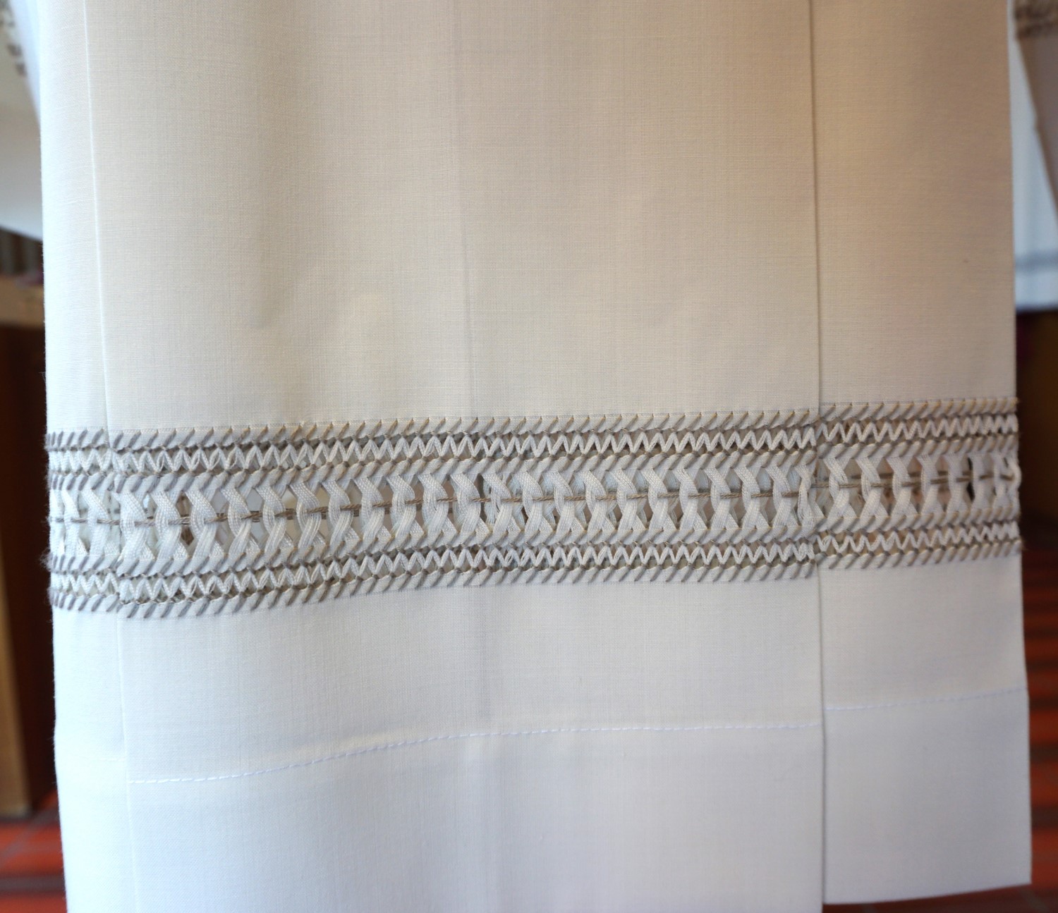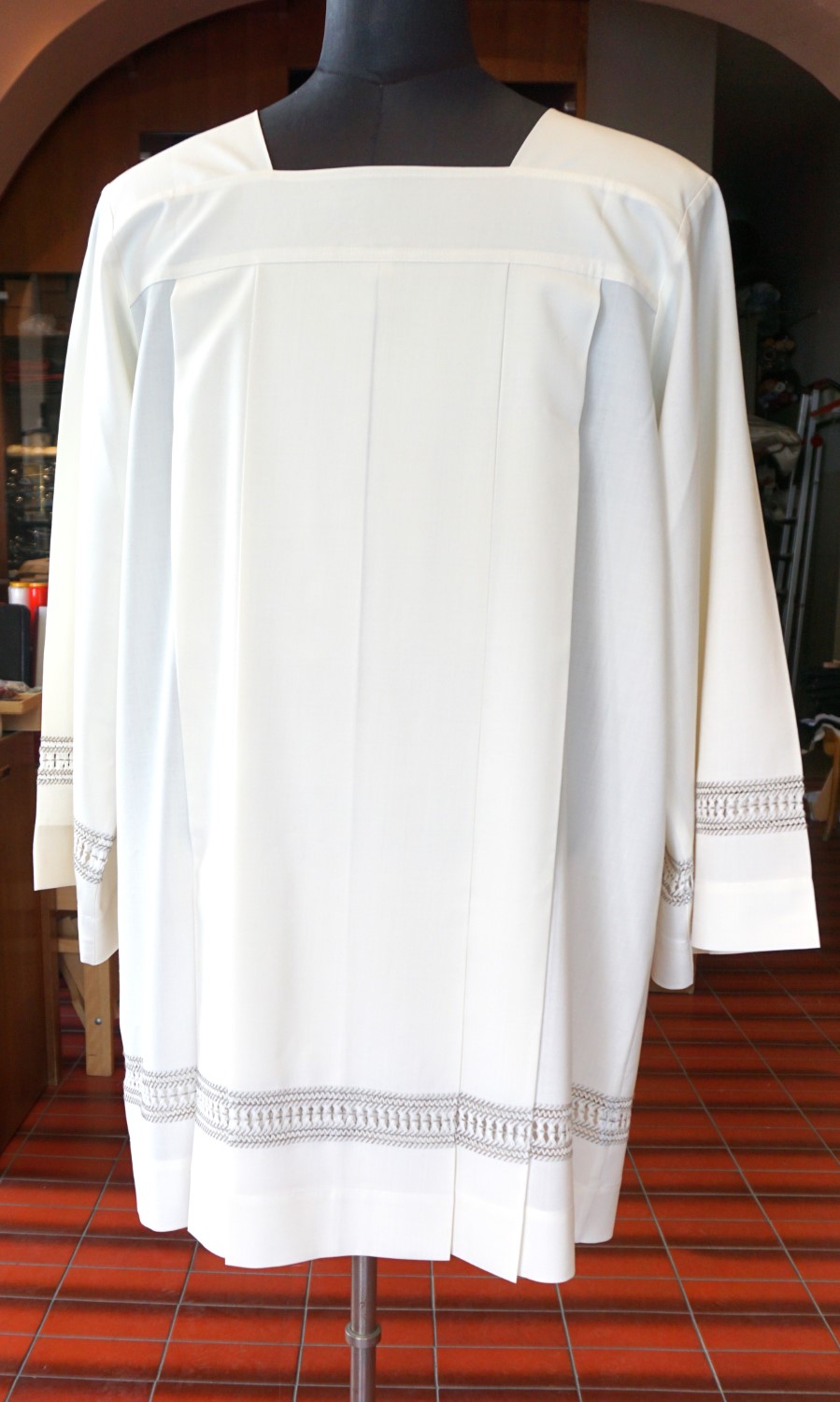 Chorrock aus eine Baumwoll/Trevira Gemisch, mit gelegten Falten. Die Stickarbeit befindet sich am unteren Saum sowie an den Ärmeln. Bitte wählen Sie die gewünschte Länge aus!