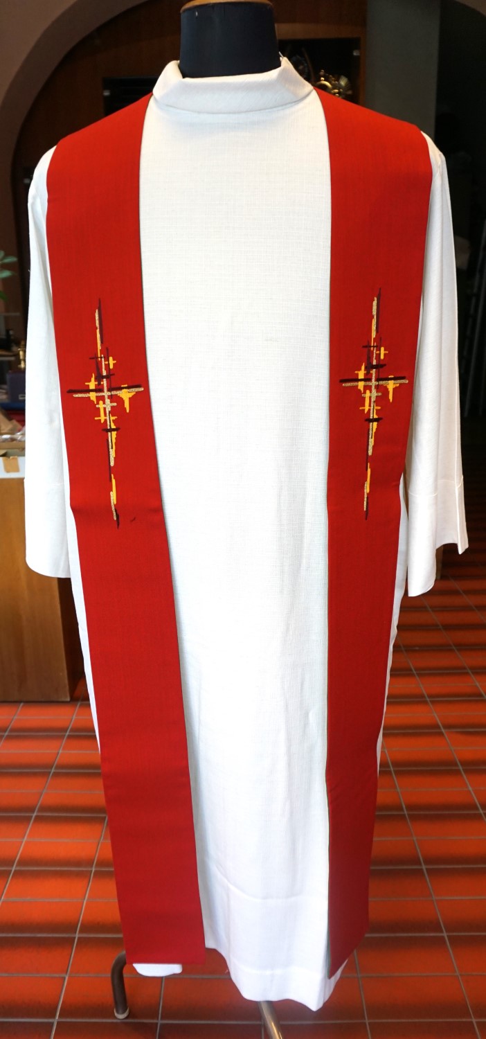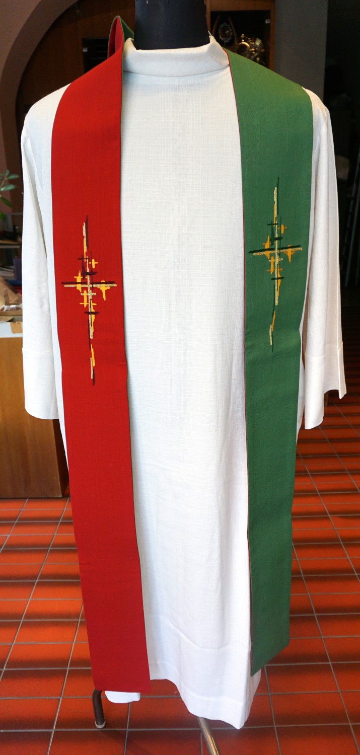 Doppel- oder auch Wendestola in rot und grün. Die modernen Kreuze sind maschinegestickt. Der Grundstoff ist ein Baumwoll/Trevragemisch und kann je Stola in seiner Grundstruktur ganz leicht variieren.