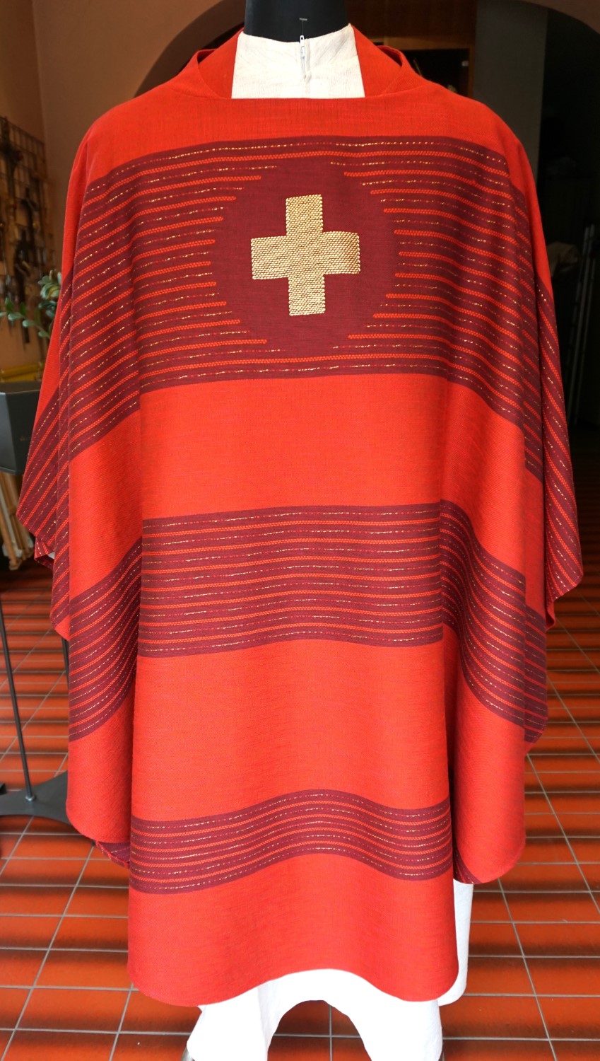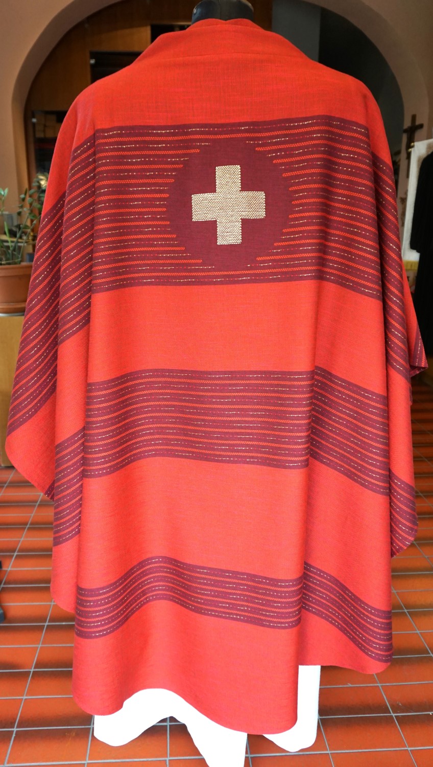 rote Casel mit Kreuz eingewoben