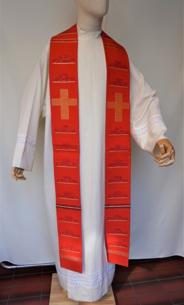 rote Priestertsola mit eingewobenen Kreuzen, Stoff: Schurwolle /Trevira Gemisch, gefüttert mit Kunstseide