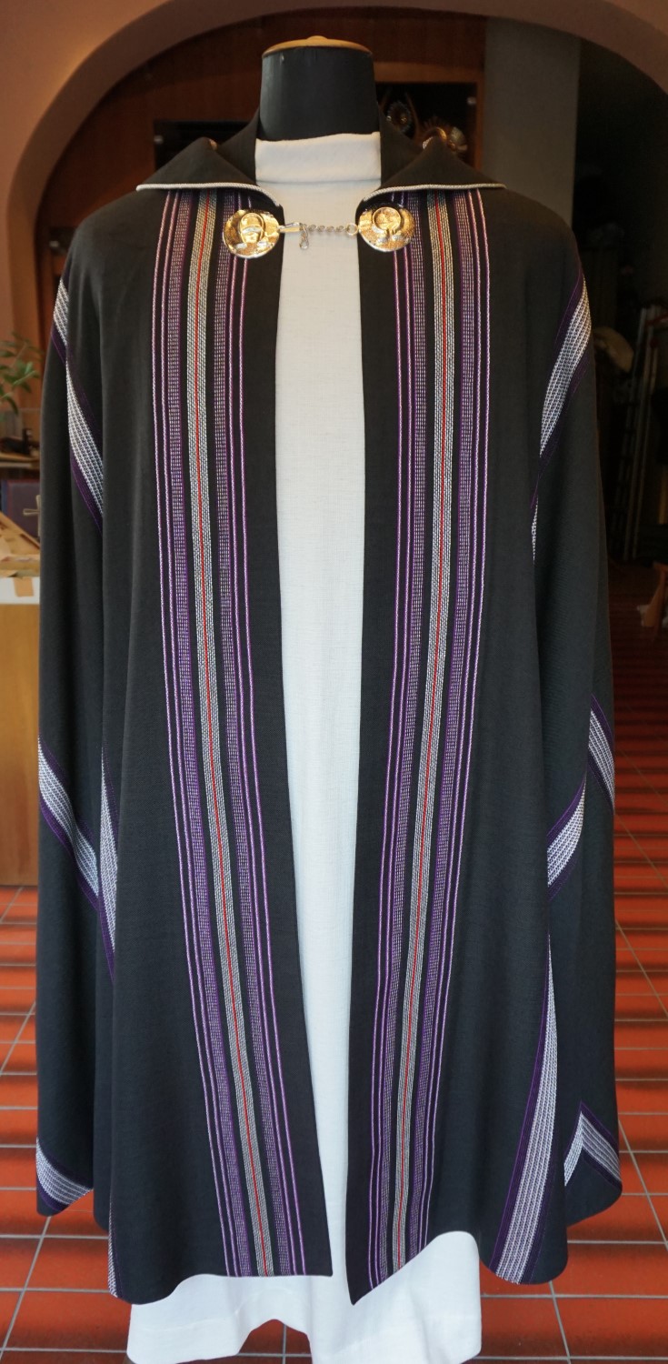 Der schwarze Chormantel ist mit Längsstreifen in Silber und in Violett gewoben. Am Rücken ist ein Kreuz mit den 5 Wundmahlen, diese mit rotem Faden, eingestickt. Der Mantel ist halb gefüttert. Die kleine Capa wird mit einer Silberrundschnur eingefaßt.Die versilberte Messingschließe ist mit den Zeichen Alpha und Omega versehen. Stoffzusammensetzung: Schurwolle/Trevira Gemisch.