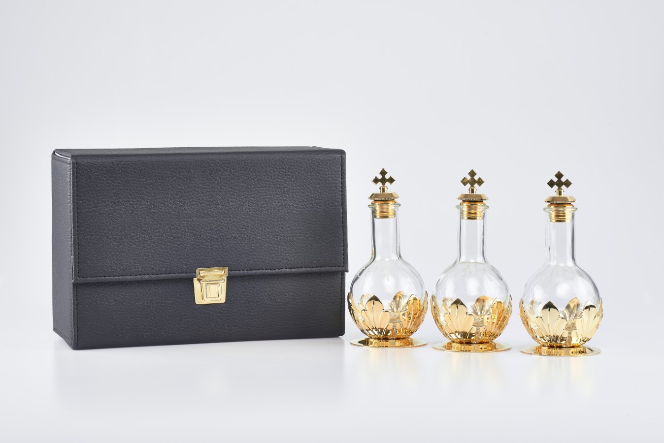 Dieses Set umfaßt 3 Fläschchen für die Heiligen Öle in einem Kunstlederetui. Das Etui hat die Maße: 16 x 24 x 11 cm. Die Fläschchen werden jeweils mit einem Schraubstöpsel verschlossen und sind in Summe 15 cm hoch. Dieses Set gibt ea auch für nur 1 und für 2 Hl. Öl Fläschen. Um die Preise für letztere zu erfahren, erbitte ich Ihre Kontaktaufnahme mit mir.