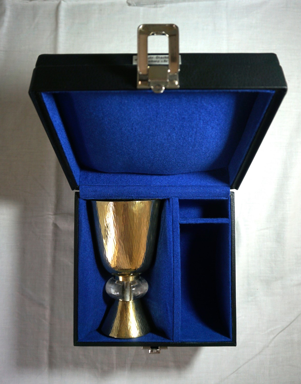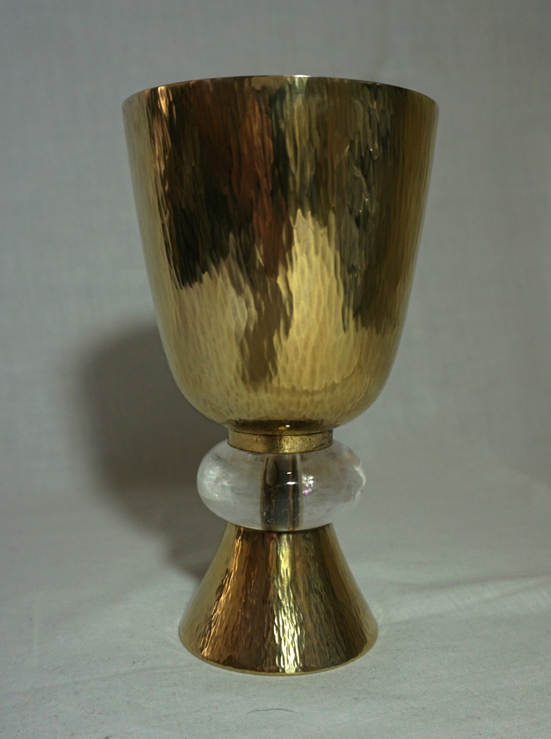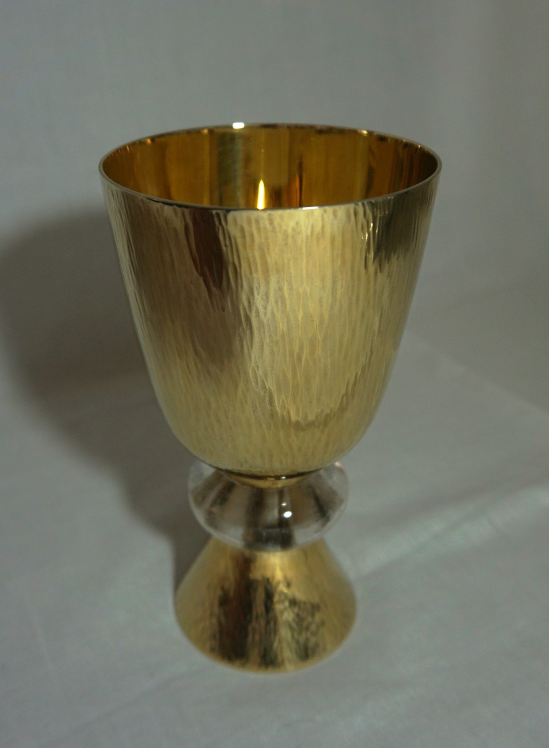 Kelch, Silber vergoldet. Nodus: Bergkristall. Kelchhöhe: ca 18 cm, Cupadurchmesser: ca 10 cm. Die Kelchoberfläche ist gehämmert. Dem Kelch ist ein Etui beigegeben.