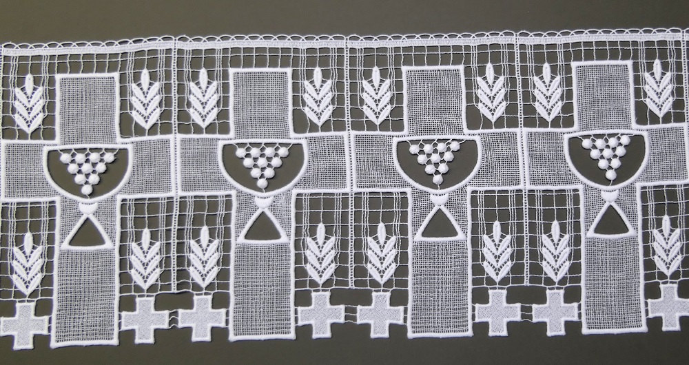 Diese 100% Baumwollspitze ist 27 cm breit und zeigt die Motive Kreuz, Ähre, Traube und Kelch. Sie ist selbstverständlich gut für Altartuchabschlüsse geeignet aber auch für Alben und Chorröcke am unteren Saum und am Ärmelsaum. Der Preis gilt je Laufmeter. Die Abgabe dieser Spitze erfolgt in ganzen Metern oder einem Vielfachen davon.