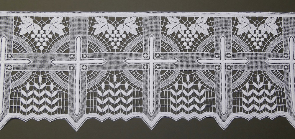 Diese 100% Baumwollspitze ist 24 cm breit und zeigt die Motive Kreuz, Ähre, Traube und Ähren. Sie ist selbstverständlich gut für Altartuchabschlüsse geeignet aber auch für Alben und Chorröcke am unteren Saum und am Ärmelsaum. Der Preis gilt je Laufmeter. Die Abgabe dieser Spitze erfolgt in ganzen Metern oder einem Vielfachen davon.
