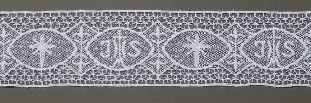 Diese 100% Baumwollspitze ist 8 cm breit und zeigt das Motiv IHS. Sie ist gut für Altartuchabschlüsse geeignet. Der Preis gilt je Laufmeter.