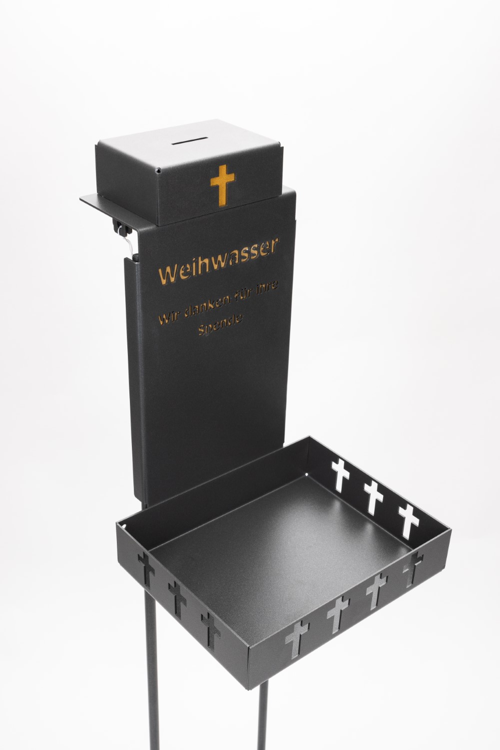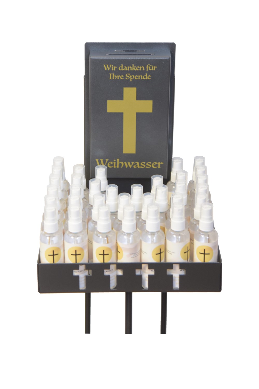 Stahlständer, pulverbeschichtet in Eisenglimmerfarbe, für Weihwasserfläschchen zur Entnahme. Auf die Abstellfläche passen ca 25 Fläschchen. Oberhalb der Abstellfläche befindet sich eine versperrbare Spendenbox. Ständergesamthöhe: ca 131 cm, Ständergesamtbreite: ca 39 cm, Ständergesamttiefe: ca 33 cm.
