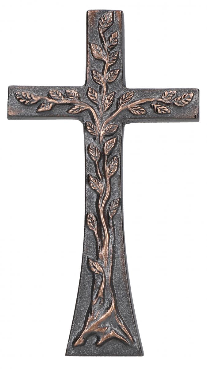 Das Stehkreuz ist aus Bronze, patiniert. Der Baum des Lebens ist symbolisch auf der Vorderseite eingearbeitet. Kreuzhöhe: 14,2 cm. Zur Erhöhung der Standfestigkeit ist das Kreuz mit einem ausladenden Boden ausgeführt.