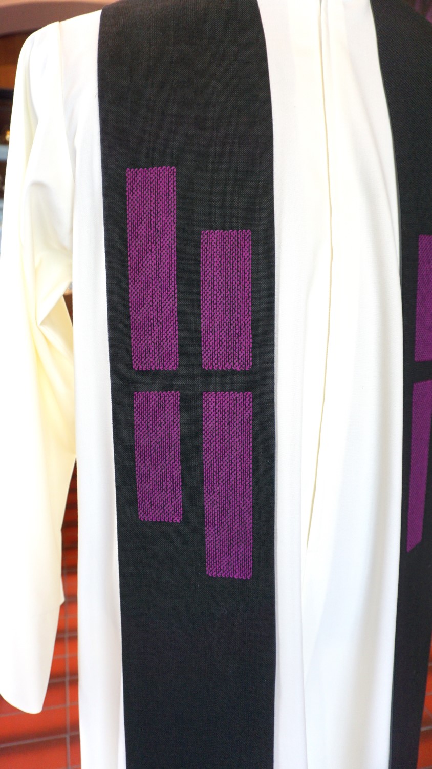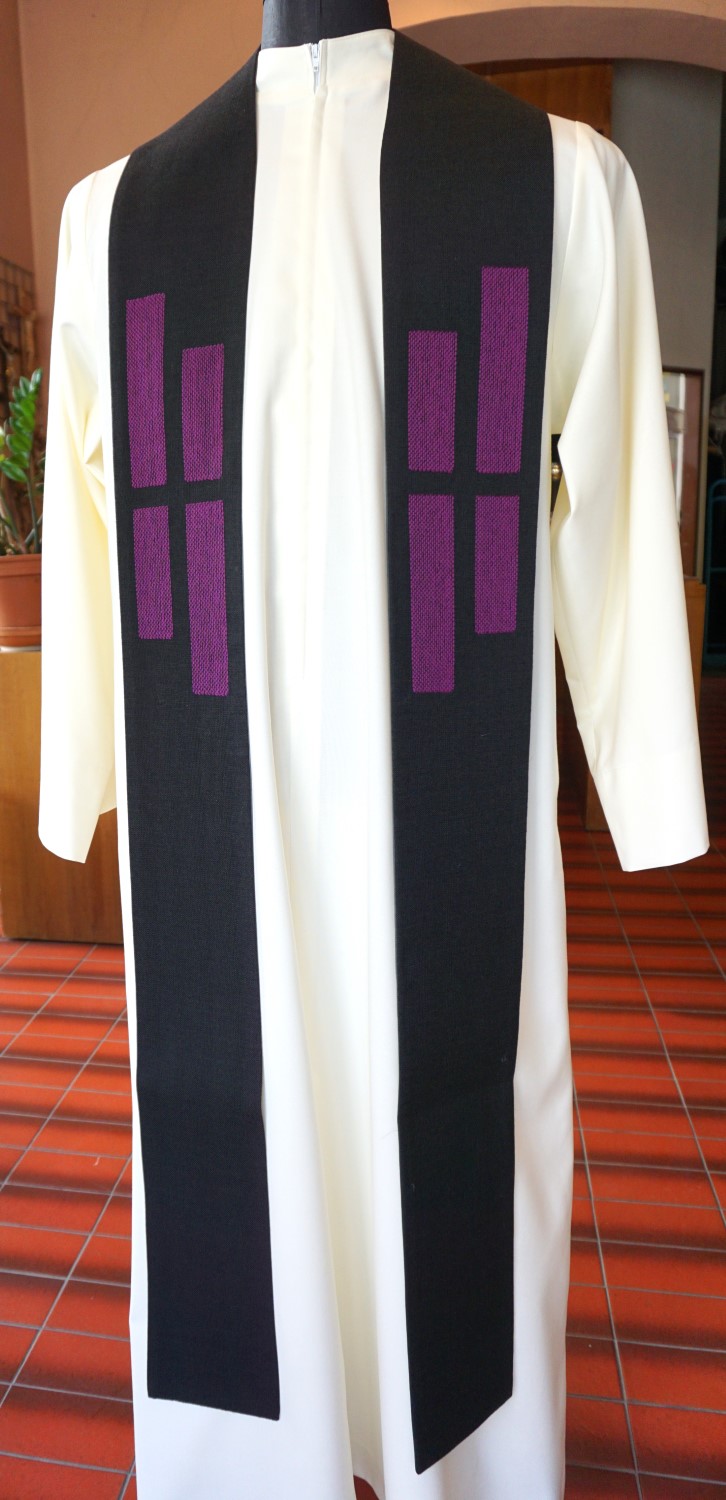 schwarze Priesterstola mit Kreuzen in eingewobenen violetten Flächen, Material: Schurwoll/Trevira Gemisch, gefüttert