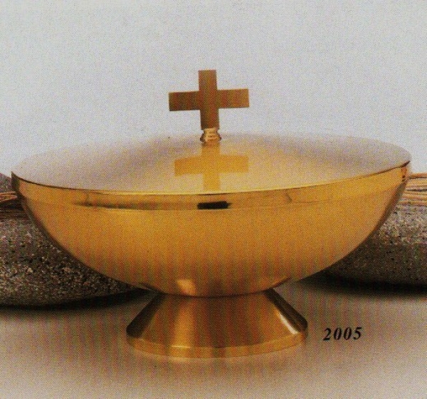 Taufbecken mit Deckel, Messing poliert und mattiert, Durchmesser: 40 cm, Schalenhöhe ca 10 cm.