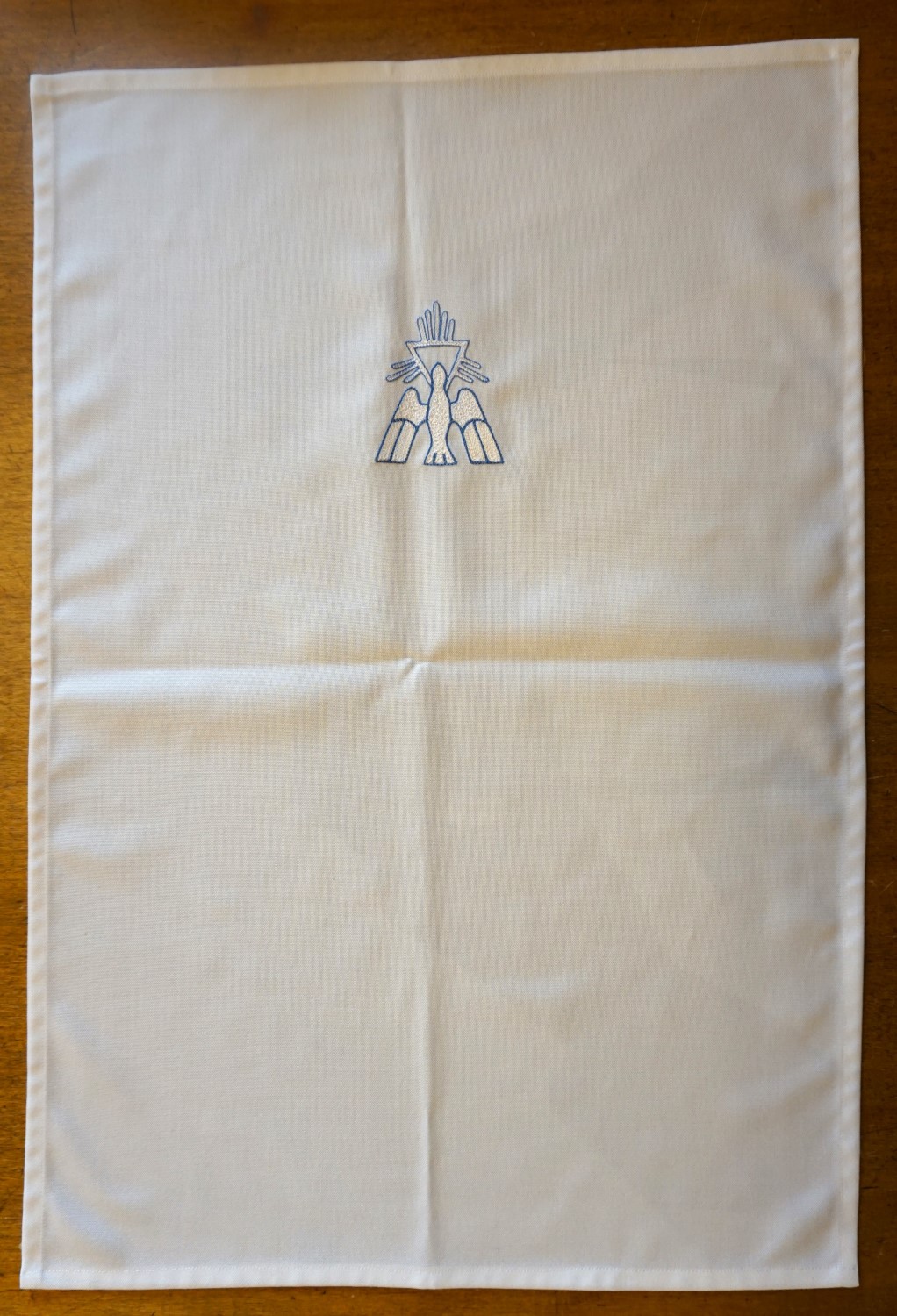 weißes Tuch aus einem Wolle/Treviragemisch mit eingesticktem Motiv, hier die Taube für den Heiligen Geist. Gerne können Sie mir andere Taufmotive in Auftrag geben, mit denen diese Decke, die über den Täufling gelegt wird, bestickt sein soll. Die gezeigte Decke hat das Maß von ca 40 x 60 cm.