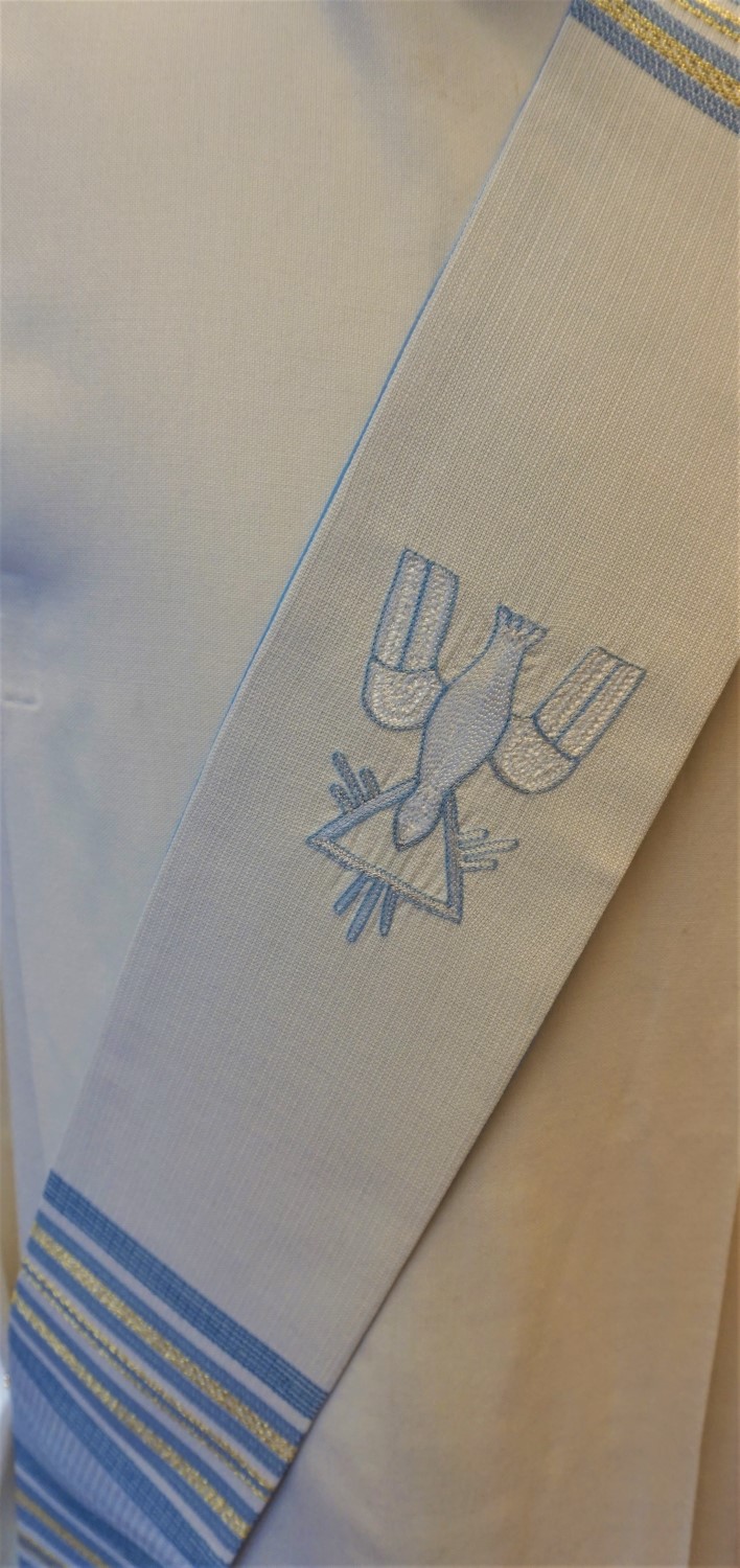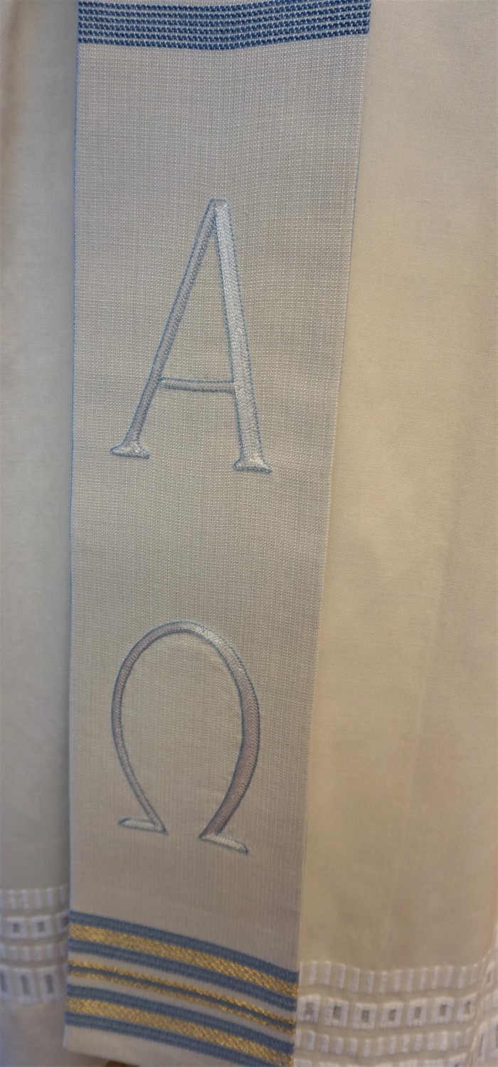 Diakontaufstola mit Hl. Geist Symbol auf der schrägen Vorderseite und Alpha und Omega Zeichen auf dem senkrechten Stolenteil; alles mit Maschine gestickt, schmale Goldlurexstreifen, gefüttert