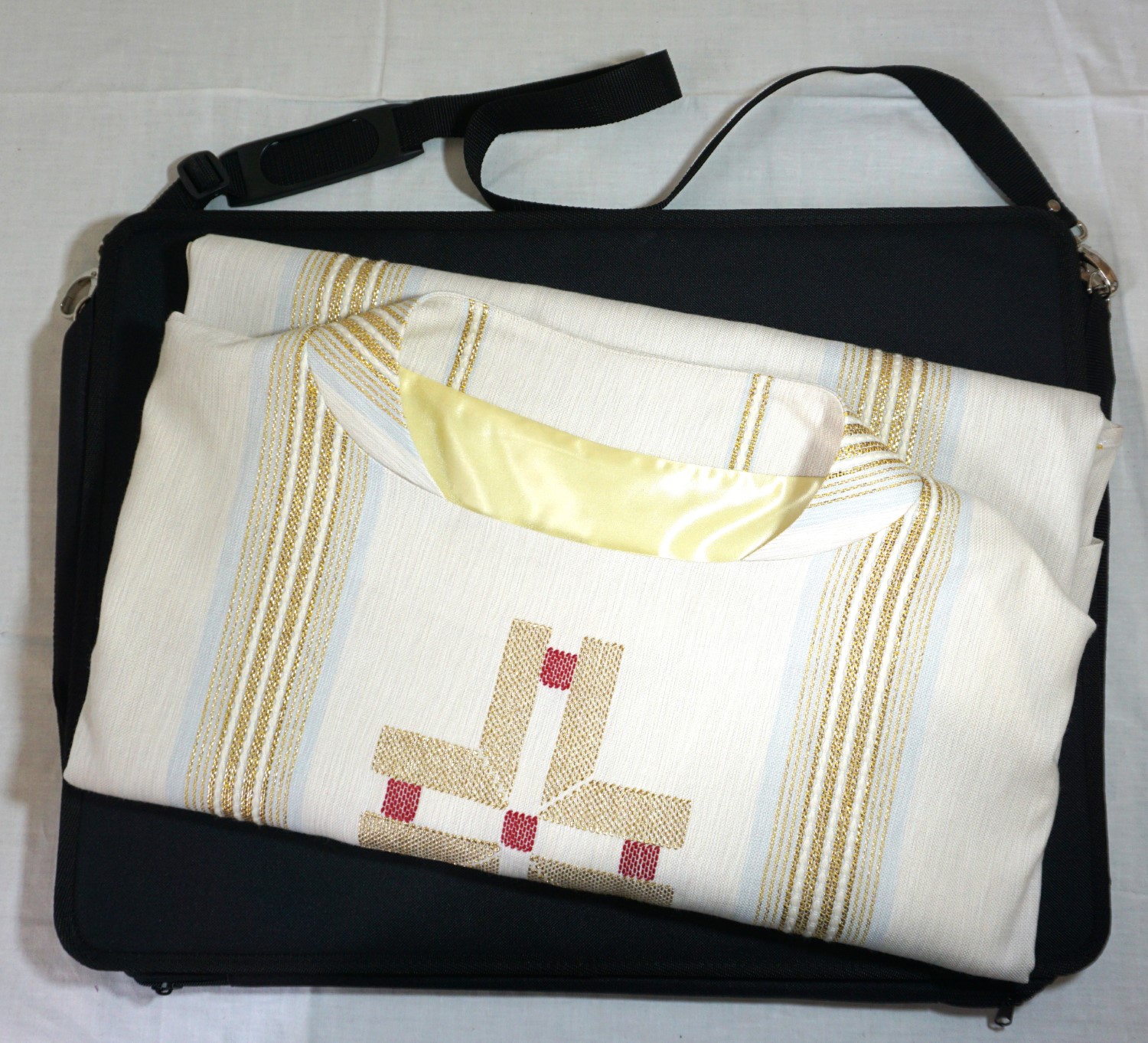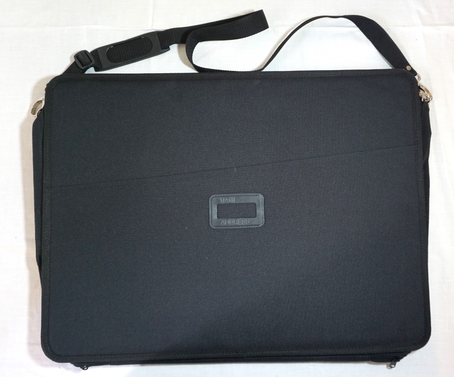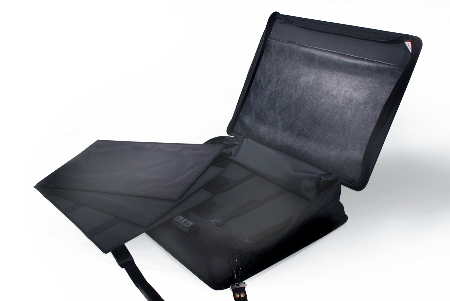Schwarze Tasche aus Kunststoff mit Maßen: 45 x 60 cm, Kann eine Höhe/Stärke von ca. 18 cm erreichen. Die Zippverschlussführung läuft über 3 Seiten. Innen sind Befestigungsgurte, 3 Einlegeplatten zwecks Unterteilungsbildung und ein extra durch einen Reissverschluß verschließbares Fach eingerichtet. Die Tasche hat einen Tragegriff sowie einen Außengurt zum über die Schulter Tragen. Durch das eingesetzte Außenmaterial ist die Tasche wasserabweisend. Außen ist ein das Anbringen eines Namensschildes vorgesehen.