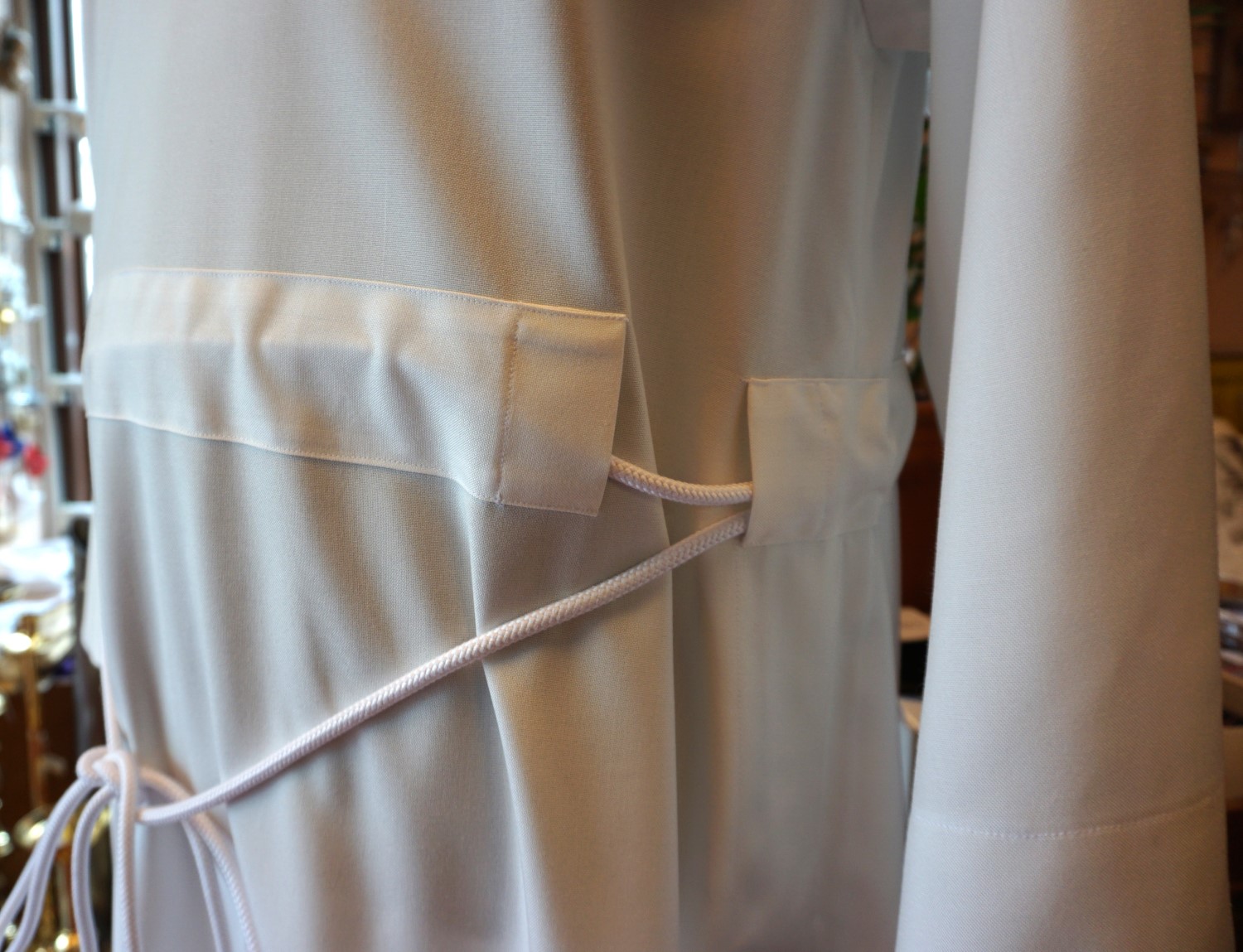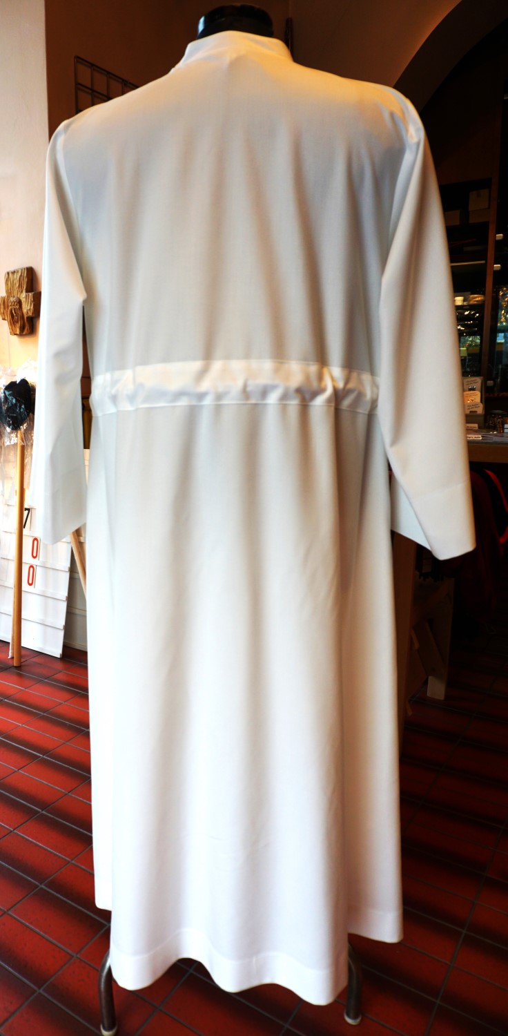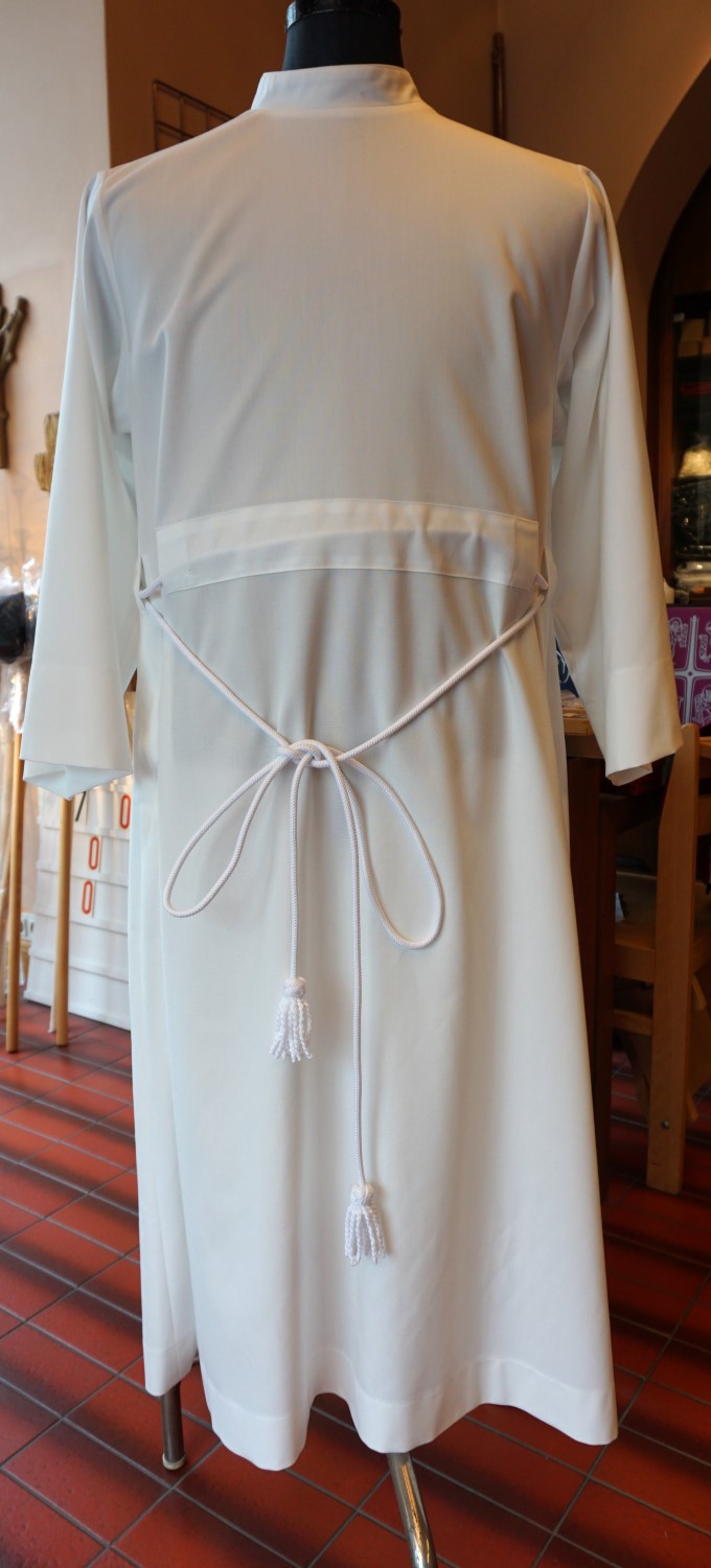 Die Albe wird über den Kopf angezogen, Stehkragen, Zipp vorne, Tascheneingriffe links und rechts, Um die Leibesmitte befindet sich ein eingenähter Kanal für ein Cingulum. Die hier angebotenen Stoffe sind sichtdicht und können mit bis zu 60 Grad gewaschen werden (Vorsicht: vor dem Waschen bitte das Cingulum herausnehmen!). Diese Albenstoffe knittern kaum.