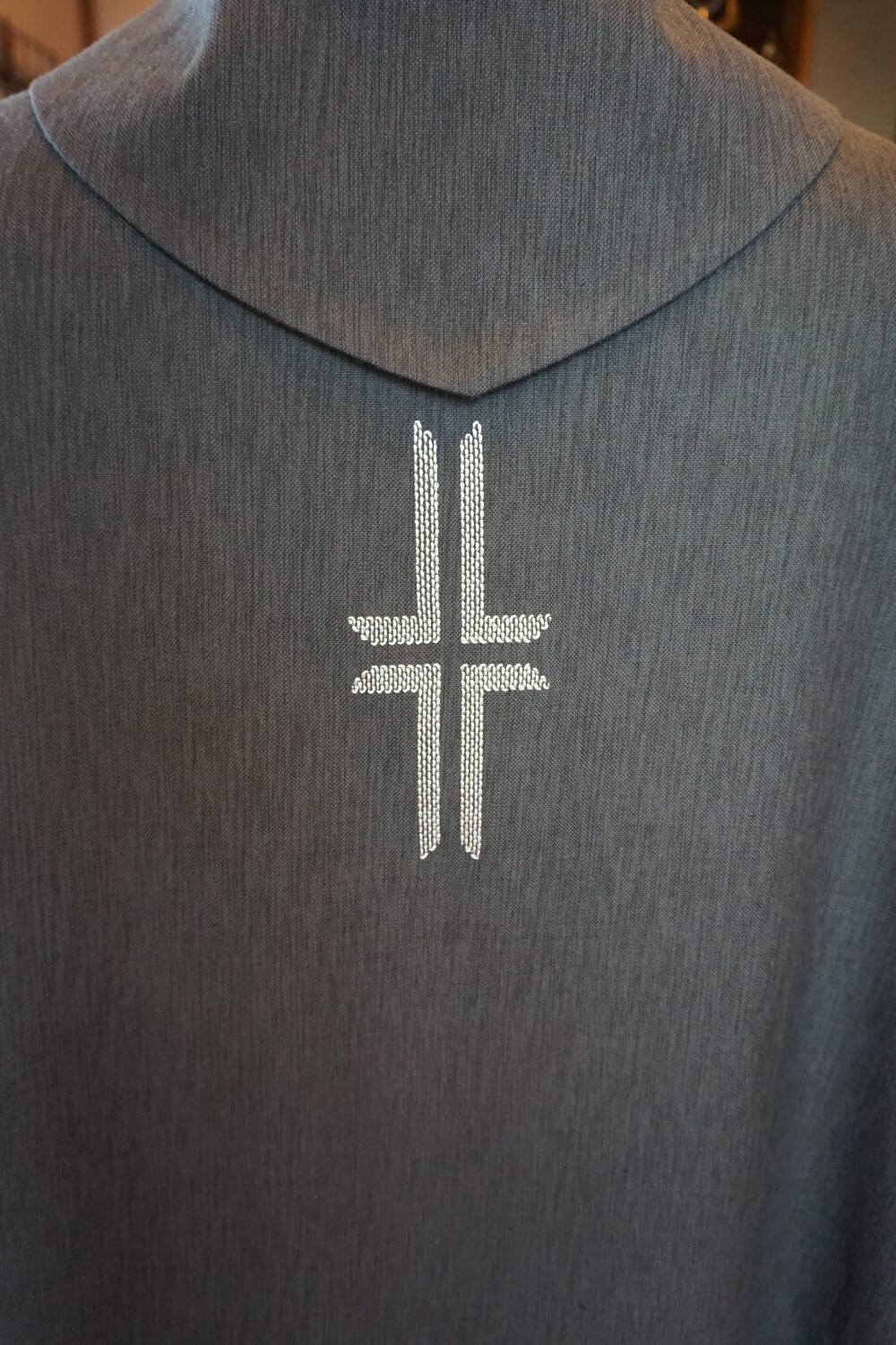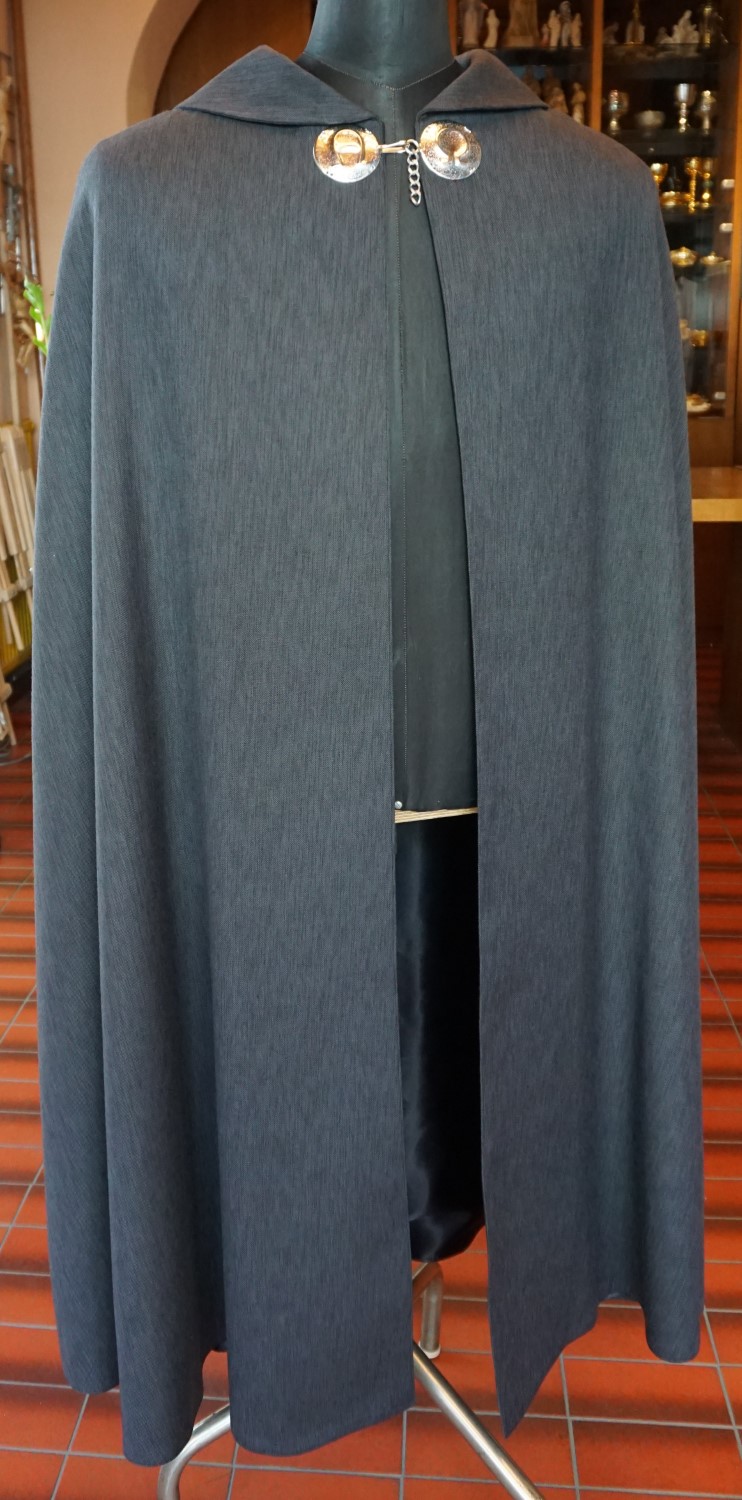Dieser Umhang ist aus einem anthrazitfarbenen Woll/Trevira Stoff geferigt und gefüttert. Am Rücken ist ein dezentes Kreuz mit Silberlurexfaden eingewoben. Die Mantelschließe trägt das geprägte Alpha und Omega Zeichen. Über der Schulter und dem oderen Rückenteil liegt ein Kapuzenansatz.