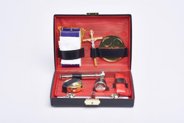 Versehetui aus Kunstleder, Hartschale, Inhalt: Kerzenständer mit Kerzen und Kreuz, Ölgefäß, Pyxis, Aspergill, Purificatorium, kleine Patene mit Hostienbeschwerung, Versehgangstola. Abmessung:15 x 21 x 5,5 cm