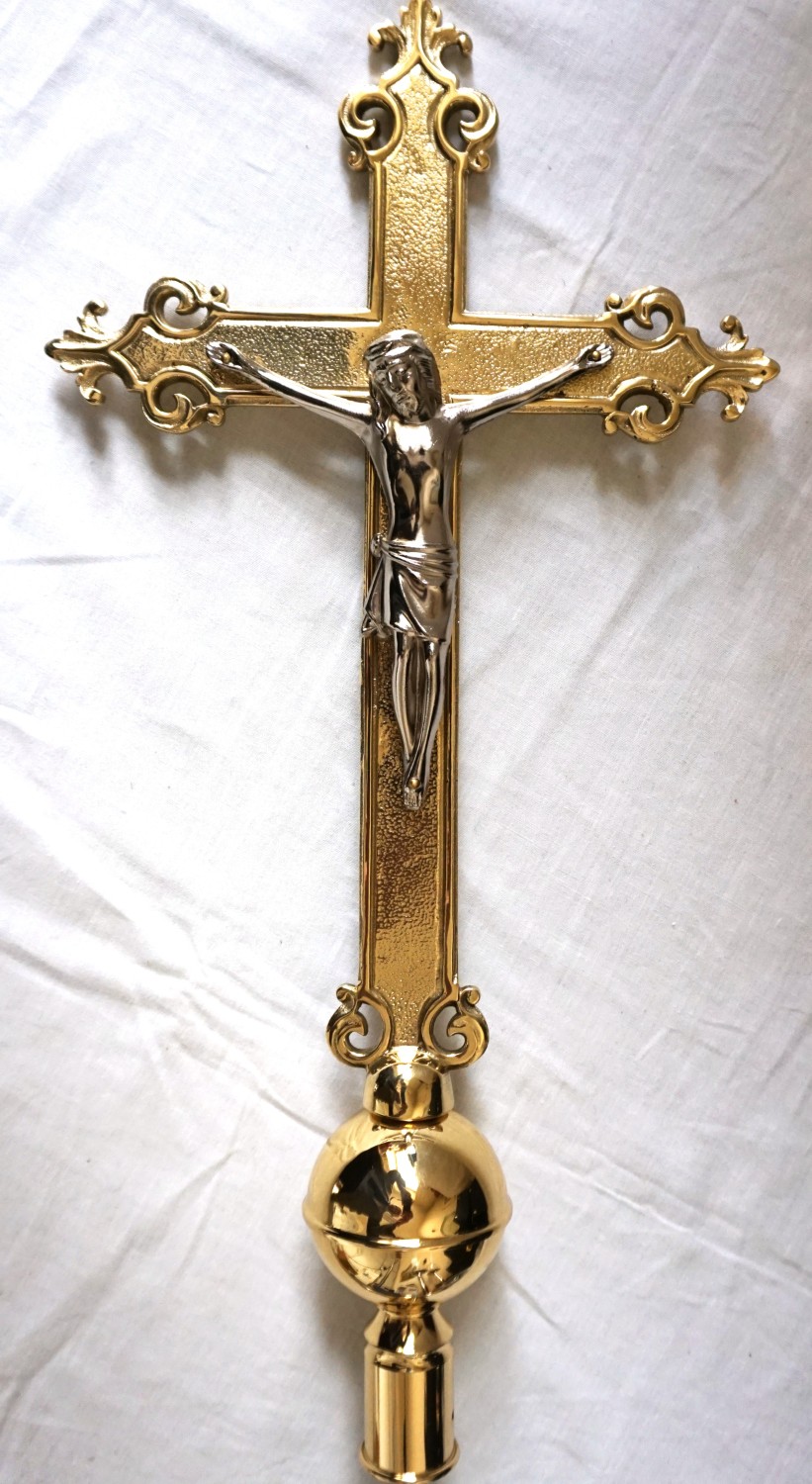 Das Vortragekreuz ist ein Messingguß, Oberfläche gehämmert, Corpus vernickelt. Kreuzhöhe inklusive Schaft und Kugel: 50 cm, Kreuzbreite: 24 cm. Im Preis ist dei Tragestange nicht inkludiert