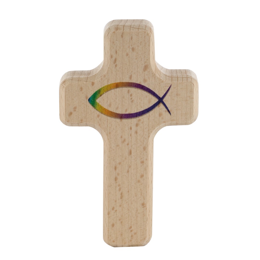 Holzkreuz aus Buche natur, farbig bedruckt, Motiv: Fisch, Höhe: 11 cm