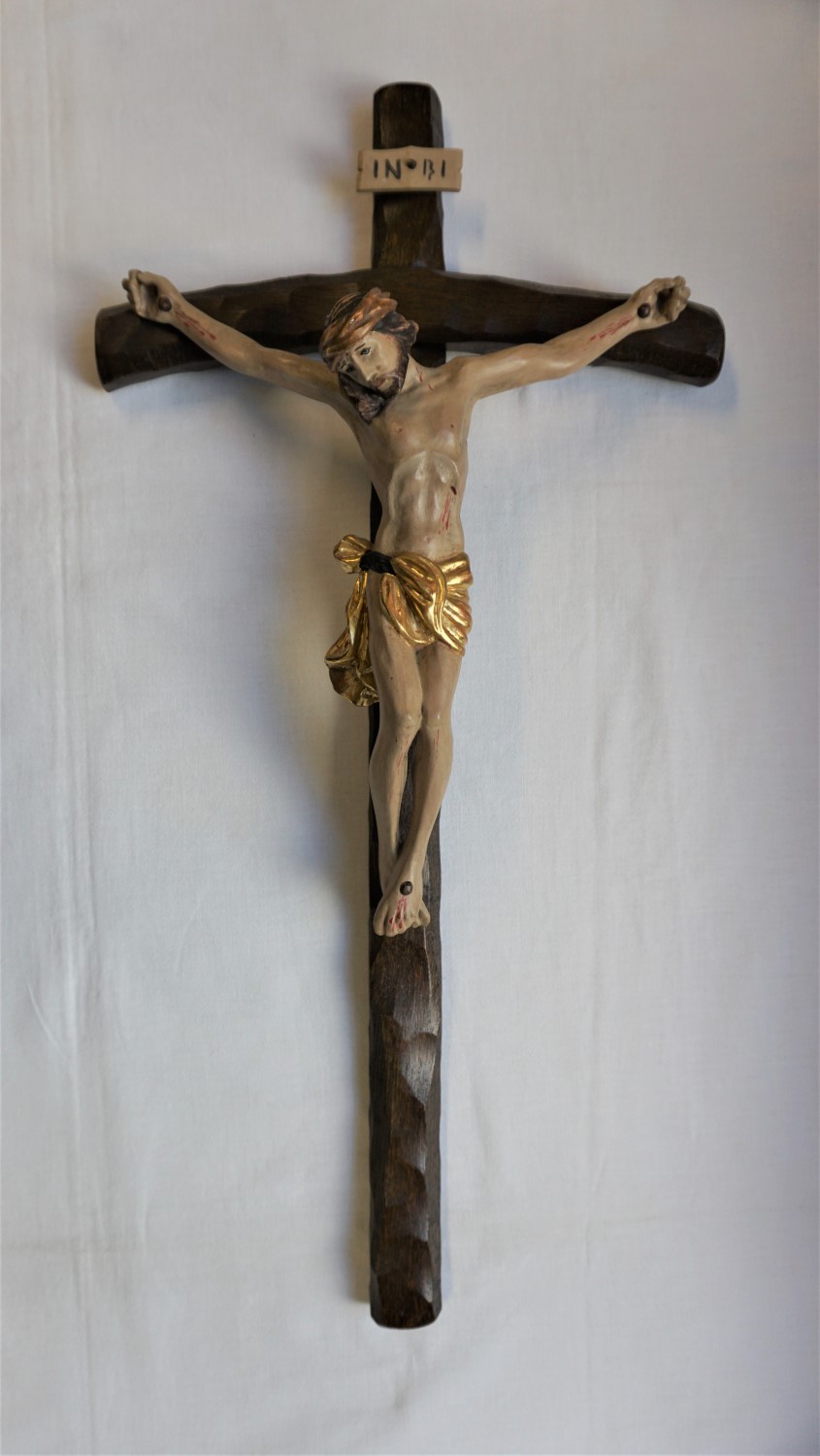 Holzkreuz mit Corpus, Corpus aus Lindenholz, Kreuz aus Eichenholz, beide Teile mit der Hand bearbeitet. Lendenschurz mit Blattgold überzogen. Kreuz an der Wand aufzuhängen. Höhe: 53,1 cm, Breite: 26,2 cm