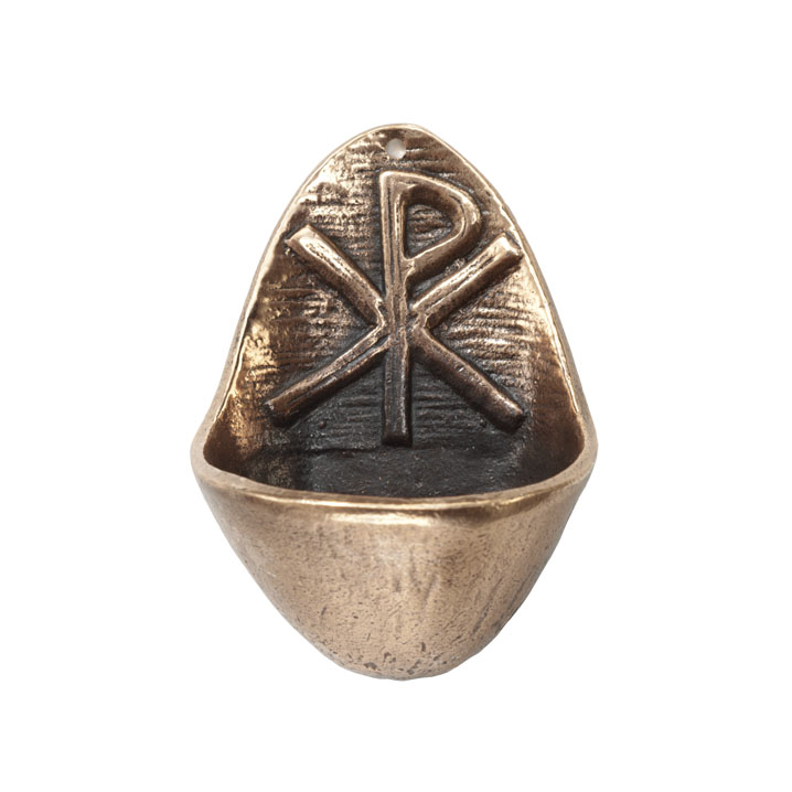 Weihwasserbecken aus Bronze, an der Wand aufzuhängen, Höhe: 8 cm, Christussymbol