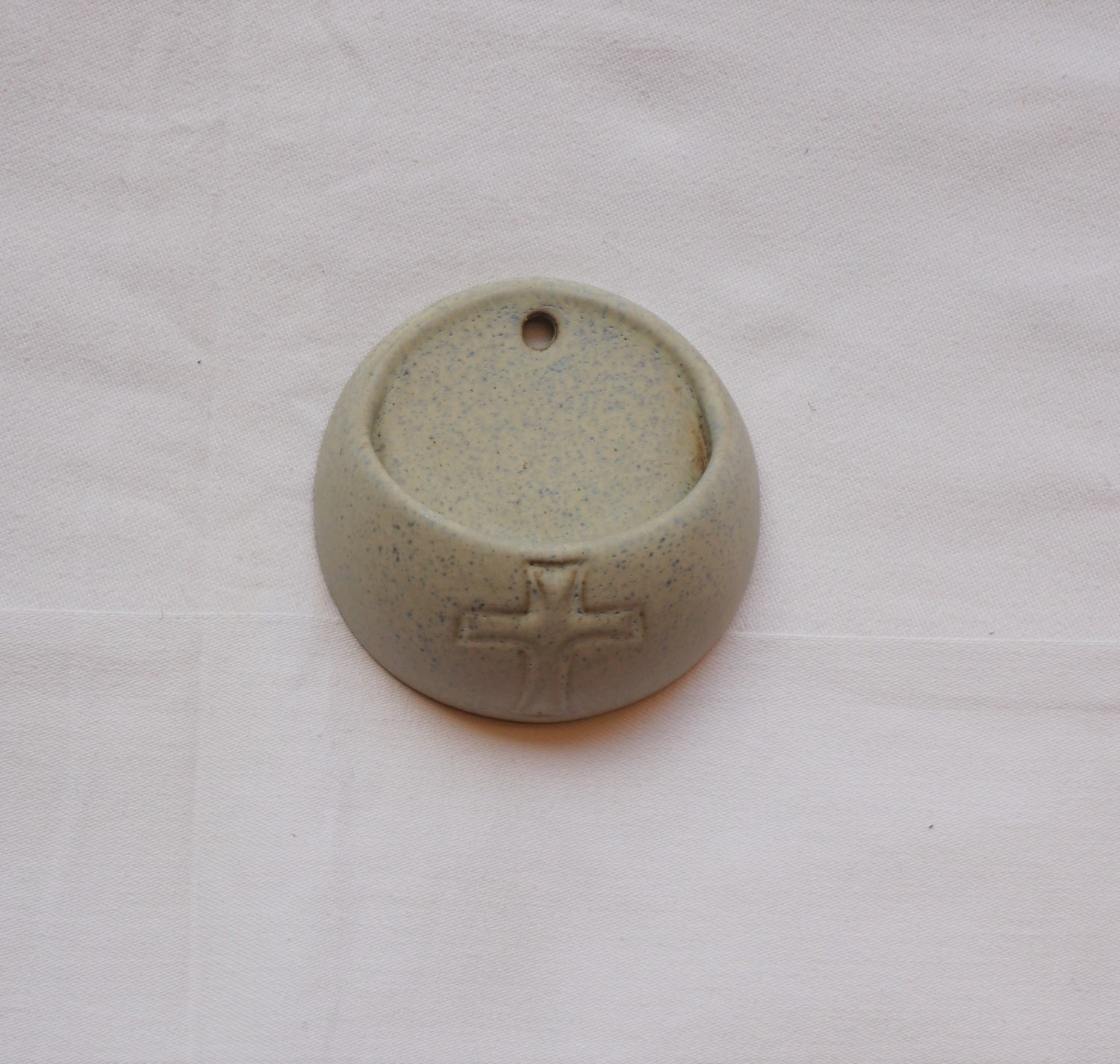 Weihwasserbecken zum Aufhängen an der Wand, Keramik, Durchmesser der Rückenwand: 8,5 cm, Kreuzsymbol