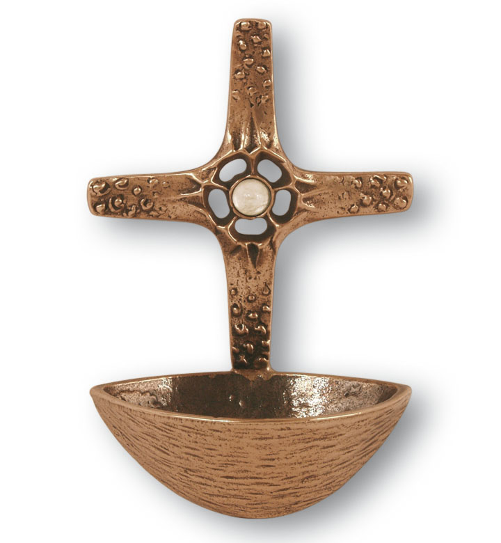 Das Wandweihwasserbecken ist aus Bronze hergestellt. In der Kreuzmitte befindet sich ein Bergkristall, Gesamthöhe: 13 cm, Breite: 8,5 cm