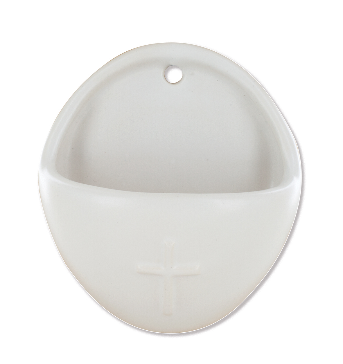 Wandweihwasserbecken aus Keramik, weiß matt, Kreuz, oval: 9,5 x 8,5 cm