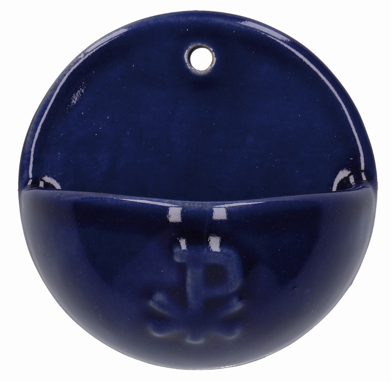 Wandweihwasserbehälter aus Keramik, blau glänzend, Christuszeichen, Rückwanddurchmesser: 7 cm