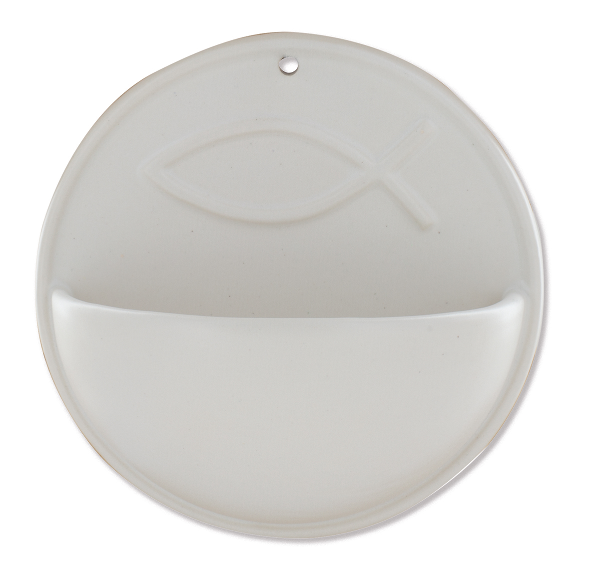 Wandweihwasserbecken aus Keramik, weiß matt, Fisch als Motiv, runde Rückenfläche mit einem Durchmesser von 9,5 cm