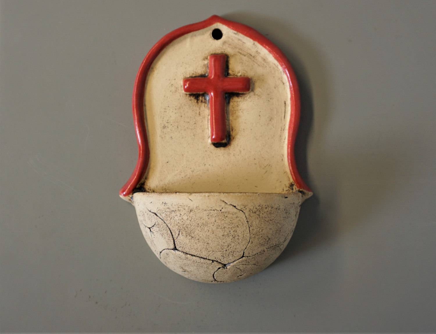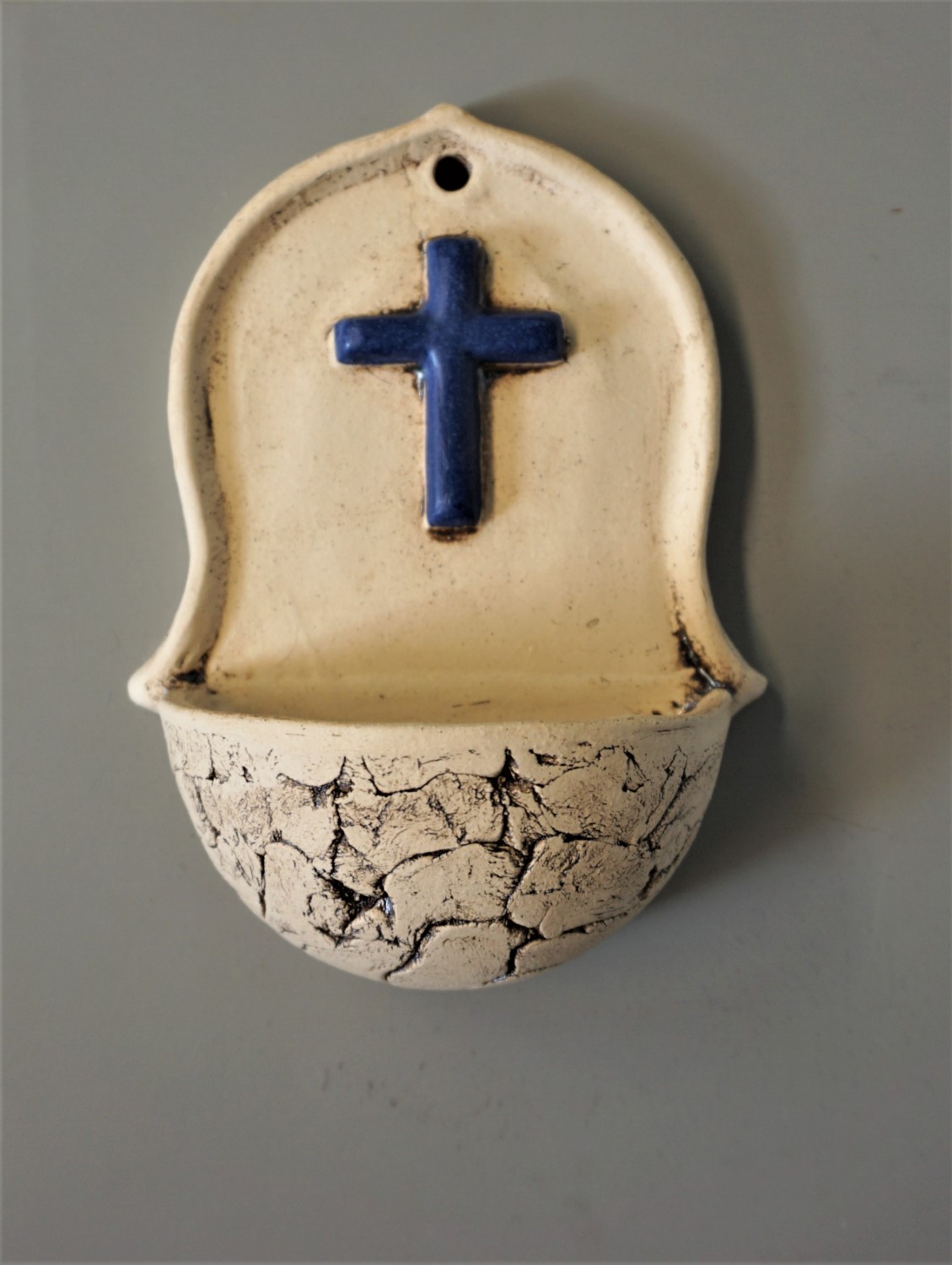 Wandweihwasserbecken aus Ton, Höhe 14 cm, Handarbeit, mit bemaltem Kreuz. Dieses Becken gibt es in roter und in blauer Kreuzausfertigung. Bitte wählen Sie aus!