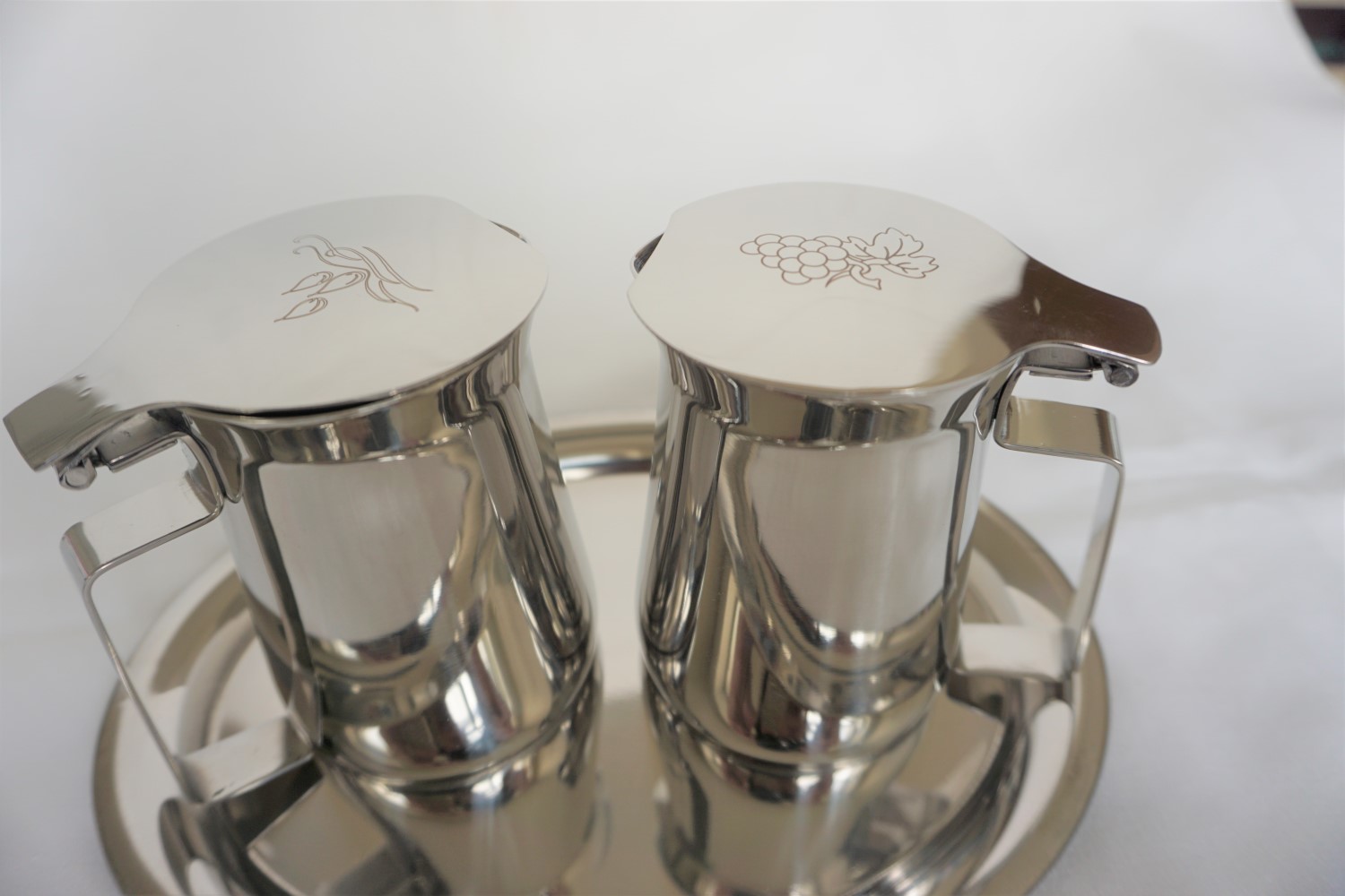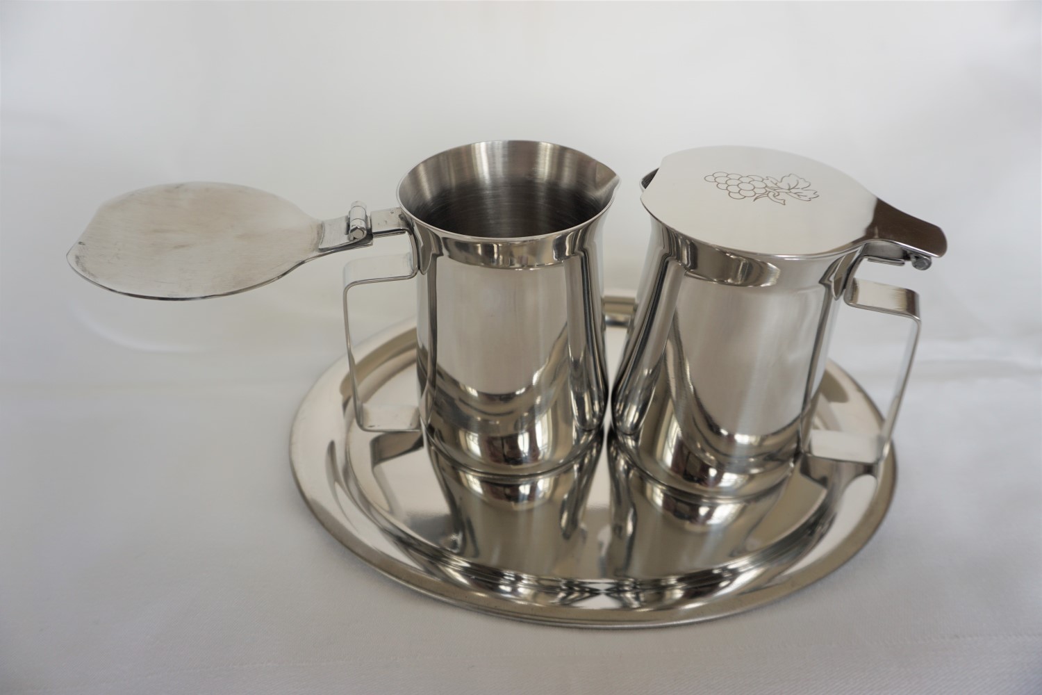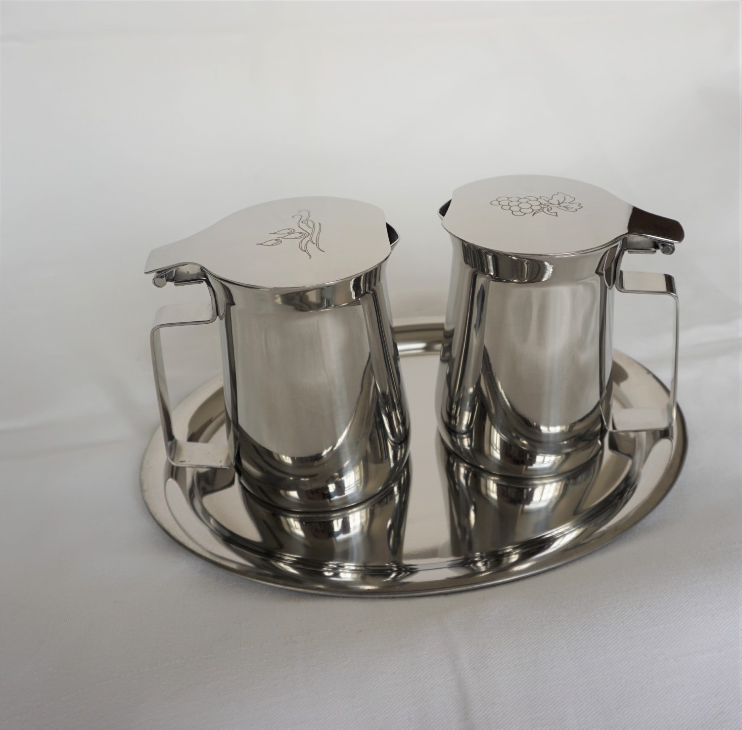 Garnitur für Wein und Wasser mit Tablett, alles aus Edelstahl, Kännchen mit Schanierdeckel( klappbar), auf den Deckeln Symbole für Wein und Wasser, Kännchendimension:10 x 6 cm, Tablettmaße: 23 x 19 cm