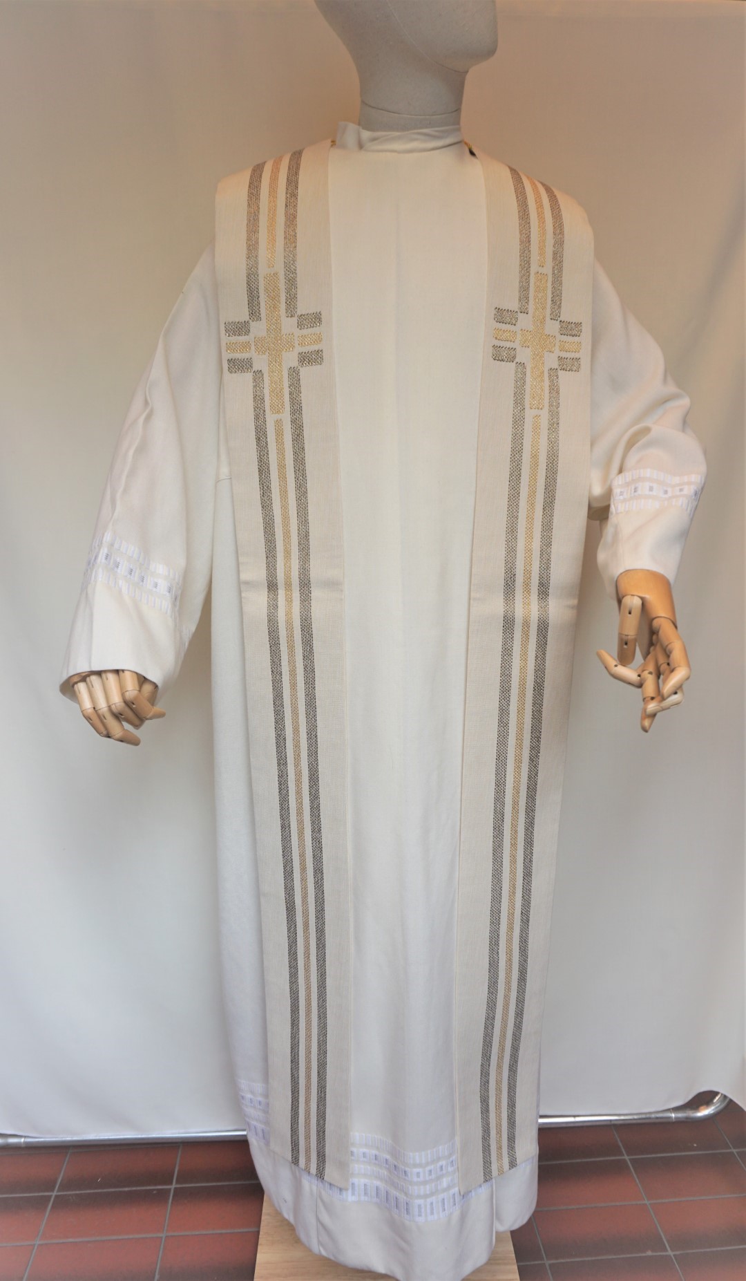 weiße Priesterstola mit Doppelkreuzen, diese mit goldenen und altgoldenen Fäden eingewoben