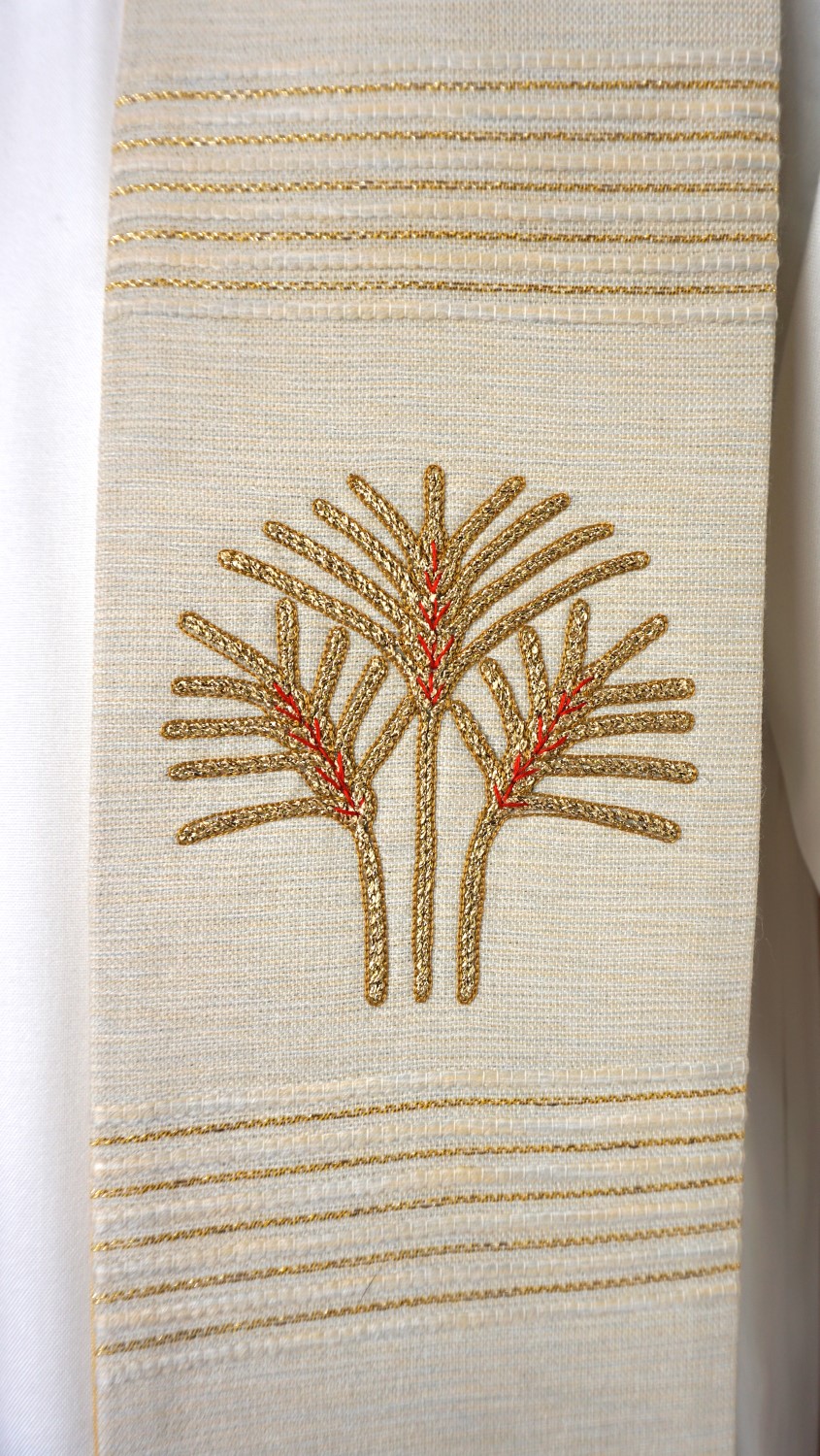 weiße Stola mit Ähren- und Traubensymbolen, mit Maschine gestickt, gefüttert.