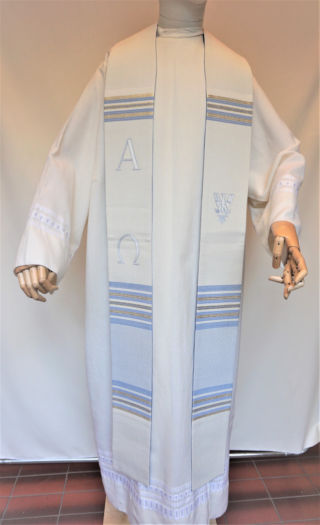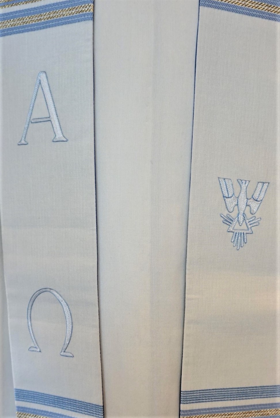 Priesterstola für die Taufe, Alpha, Omega und Hl. Geist Symbol sind mit der Maschine gestickt